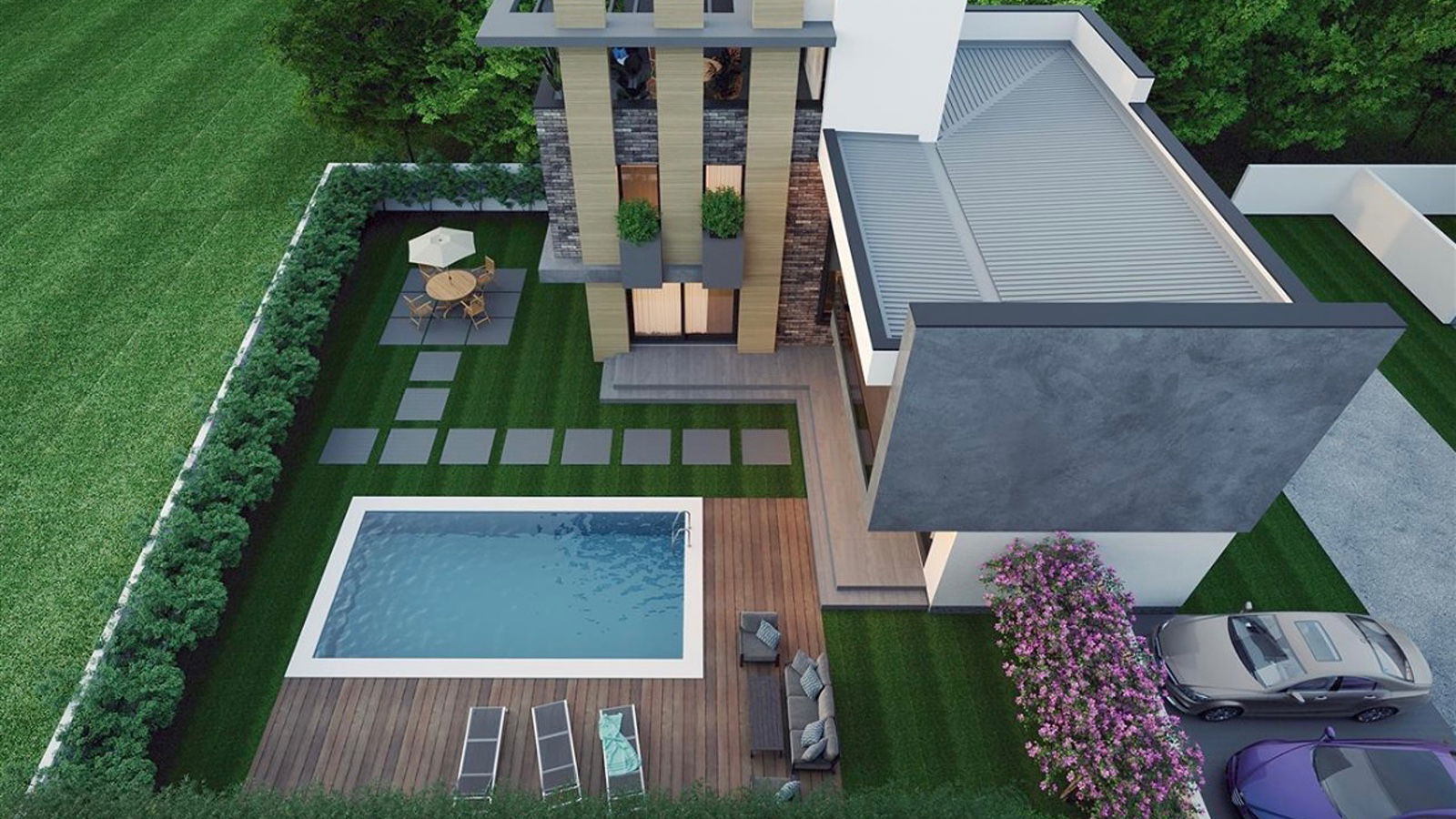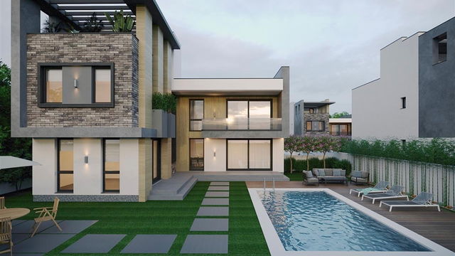 FINO Complex is built on a total area of 3,000 m² and consists of luxury houses on plots of 400–500 m² with 280–320 m² living space and 350–450 m² private gardens. Each house features a private 8x4 m swimming pool and 2-car parking; 4 houses include a 40 m² rooftop terrace. Heating is provided by heat pumps. Delivery: May 2026.