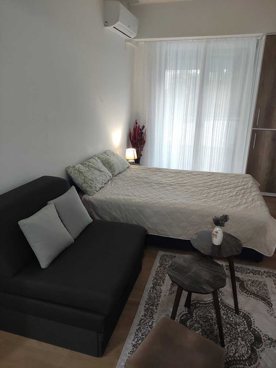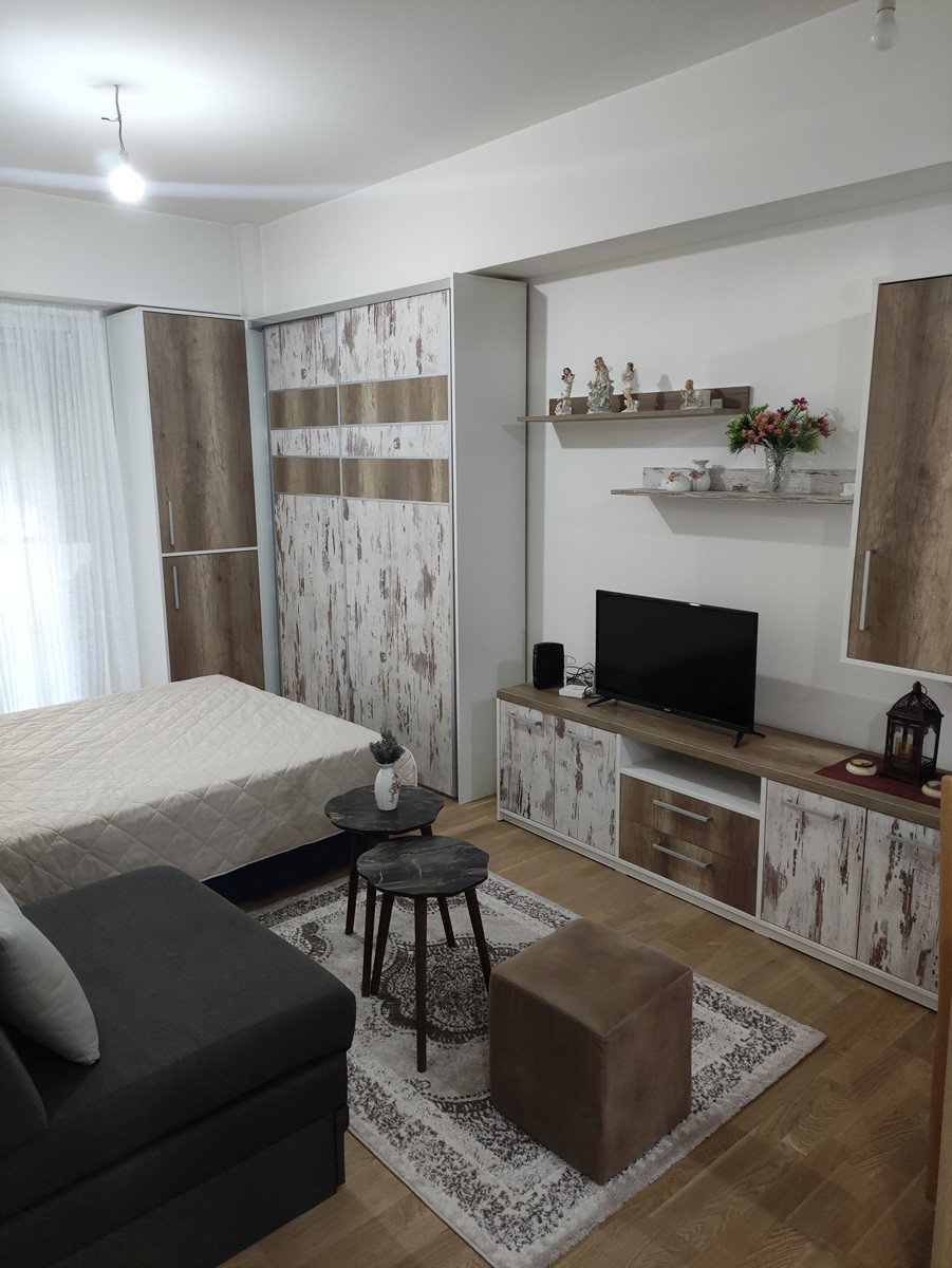 A furnished modern studio apartment of 32 m2 is available for short-term daily rent in Aerodrom. The apartment features an open-plan living room with a kitchen, offering a comfortable and functional stay. It includes 1 fully equipped bathroom. With its central location, it provides easy access to transport, shopping, and daily amenities. Ideal for short stays, this apartment offers a clean and convenient living space.