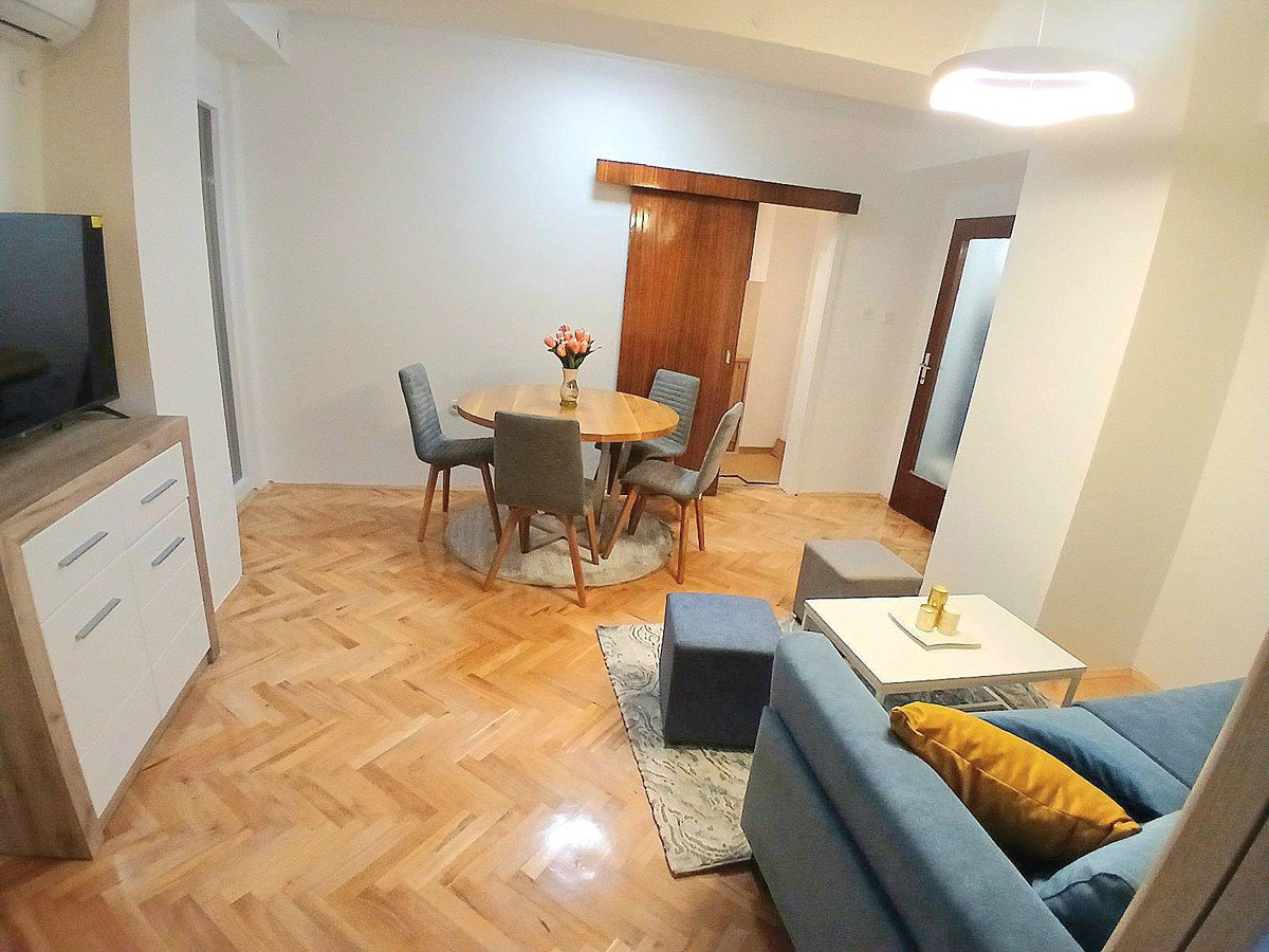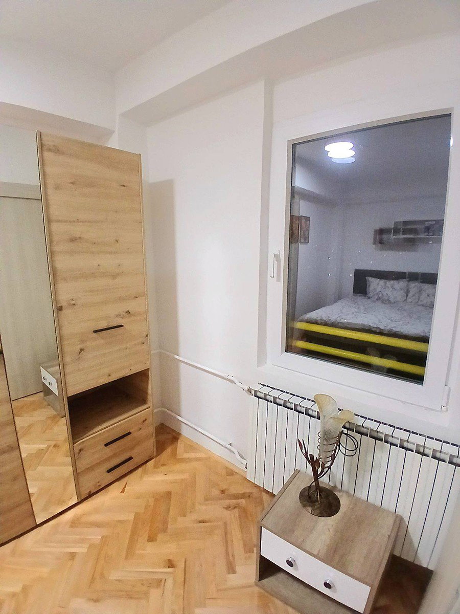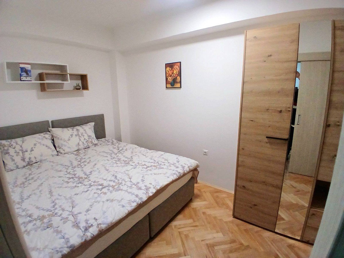 This fully renovated and furnished 45 m² apartment for rent is located near the railway station in Skopje. It includes 1 bedroom, a living room, kitchen, bathroom, and terrace. The apartment is equipped with new furniture and new appliances. Heating is provided by an inverter air conditioner. Free parking is available. It offers a comfortable and move-in-ready living space. Monthly rent: €350.