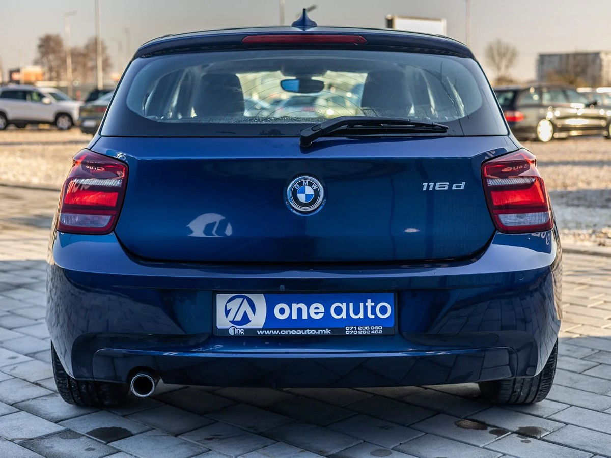 BMW 1 Series 116d EfficientDynamics Edition, модел 2013, 1.6 турбо дизел 85 kW (116 КС) со 6-брзински мануелен менувач. Прва регистрација 01/2013 со 242.231 км. Заден погон (RWD) и просечна потрошувачка 3,8 L/100 km со повеќе од 850 km домет по резервоар (EURO 5). Оригинална сина боја, 5-вратен хечбек со 360–1200 L багажник. Опрема: панорамски кров, автоматска клима, мултифункционален волан со Servotronic, 6,5” навигација со BMW iDrive, DAB радио, Bluetooth/USB/AUX, 16” алуминиумски бандажи, магленки, сензор за дожд и светло, ISOFIX, темпомат и ABS/DSC/DTC системи. Редовно сервисирано со проверена километража. Ново увезено и не е користено во Македонија; платени се сите давачки.
