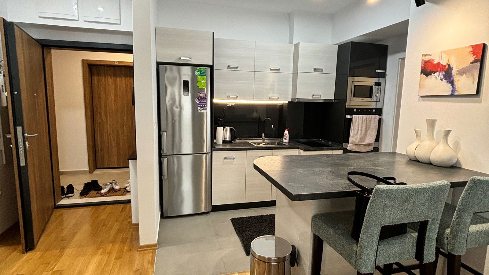 Станот во East Gate Living располага со модерна кујна со дневна соба во отворен концепт, балкон и тераса со поглед. Се наоѓа на чекор од јавен превоз и е многу блиску до маркети, ресторани и трговски центри. Исто така има лесен пристап до зелени површини и паркови. Депозитот е во висина на една месечна кирија. Се преферира долгорочно изнајмување.